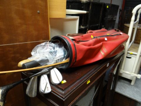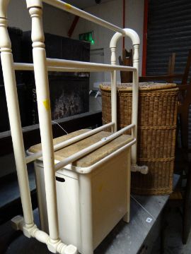 A vintage towel airer, two linen baskets & an old set of golf clubs in Slazenger bag etc