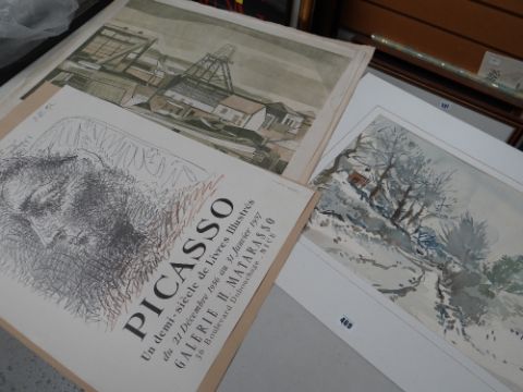JOHN BRUNSDON unframed artists proof (5/10) entitled 'Pass, Near Cader Idris', signed, unframed & signed watercolour of a lane, linocut of a colliery & Picasso exhibition poster from 1957