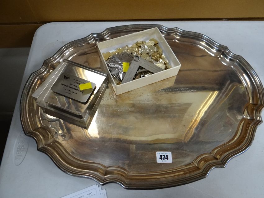 A large EPNS variety club presentation tray together with a selection of variety club badges & an award