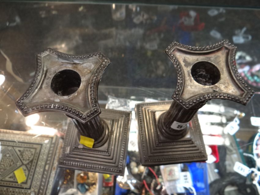 Pair of hallmarked silver short Corinthian columned candlesticks