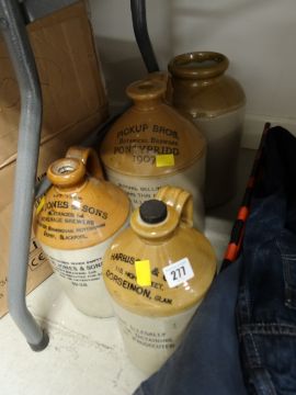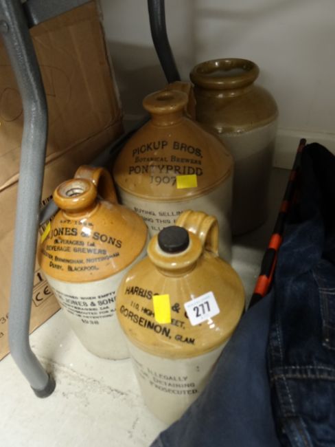 Three vintage stone glazed bottles & storage jar by Pick Up Brothers, Pontypridd, Harrison & Co, Gorseinon, H Jones & Sons Brewers