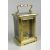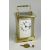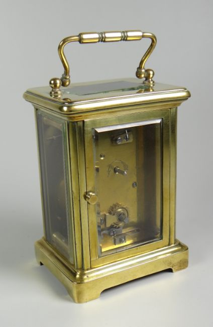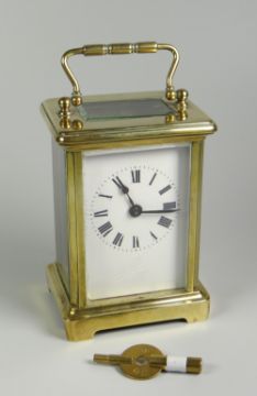 AN ENGLISH MADE BRASS CASED CARRIAGE CLOCK having a white enamel dial with Roman numerals, 15cms high including handle (key with us) (BBC Bargain Hunt)