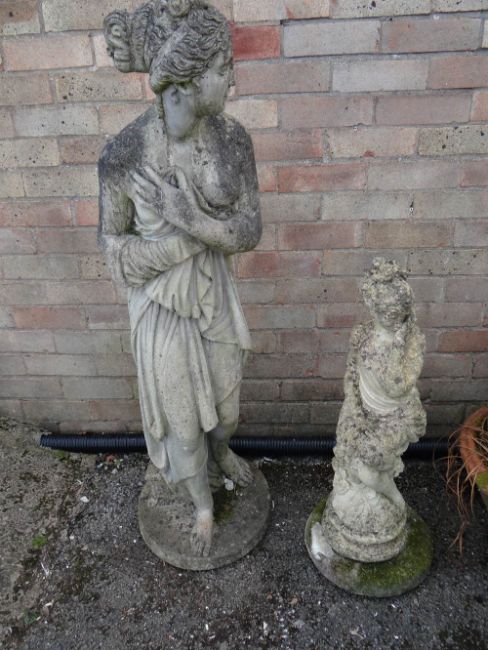 Two composite garden statues, Pandora & another (outside)