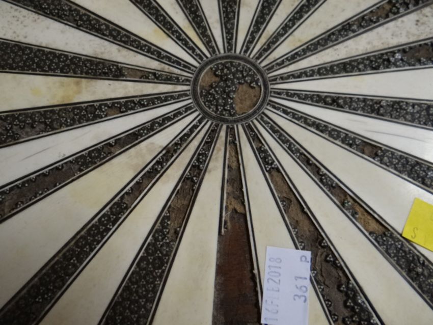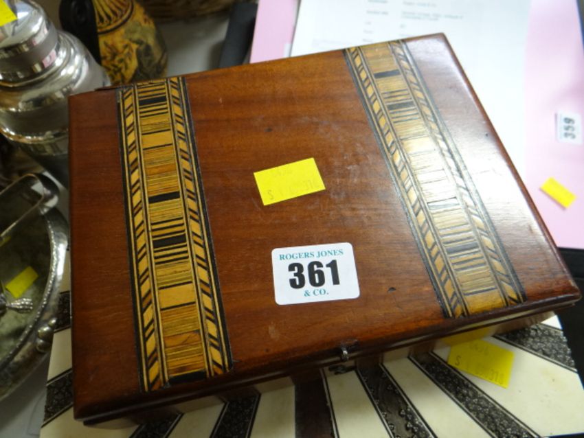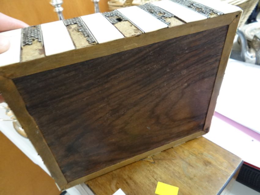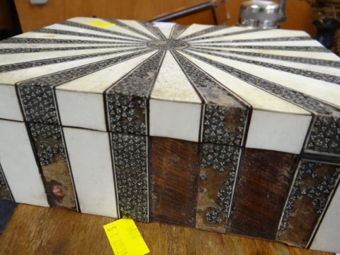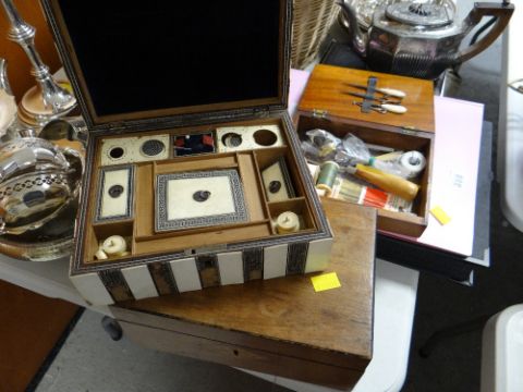 An ivory & patterned ebonized decorated sunburst effect sewing box (distressed) together with two other wooden boxes containing sewing itemscondition report:There is quite a bit of wear to the inlay on the ivory box