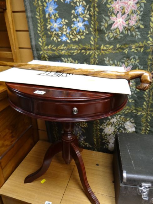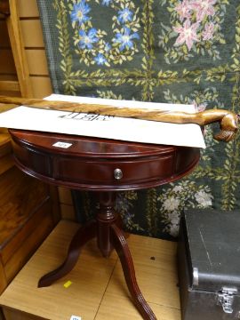 A drum-style reproduction tripod table & a lion head walking cane etc