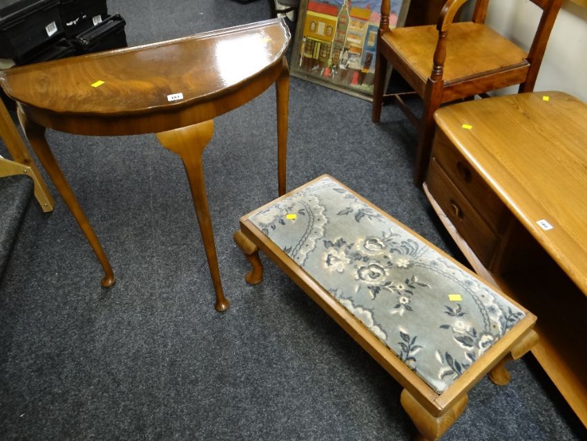 A reproduction mahogany demi-lune hall table together with a cushion topped long footstool