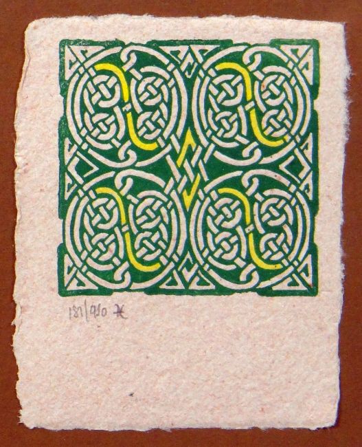 UNKNOWN limited edition (181/450) print - Celtic motif in green and yellow, monogrammed, 9 x 7cms