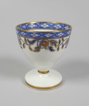 A RARE SWANSEA PORCELAIN EGG CUP decorated with a continuous band of blue and gilded flowers & motifs, 5.1cms high