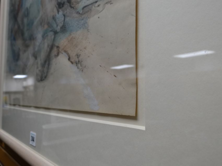 RAY HOWARD JONES mixed media - landscape with mask, entitled 'Amores' on original label with 10gns price, signed Ray, dated 1949, 40 x 54cmscondition report:Yes the painting is on paper, there are slights marks on the left edge of the paper but I’m not sure if they are supposed to be there or not.The original label has been attached to the back
