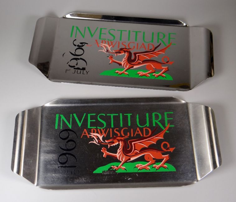 A PAIR OF PAINTED STAINLESS STEEL INVESTITURE TRAYS to commemorate Prince Charles invesiture on July 1st 1969 and featuring The Welsh Dragon, 36cms