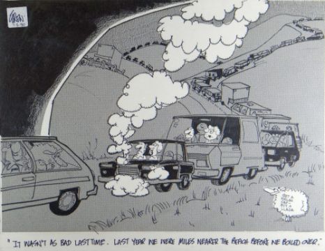 GRENFELL 'GREN' JONES MBE (1934-2007) original drawing - humorous satirical cartoon relating to Bank Holiday traffic, captioned 'It wasn't as bad last time. Last year we were miles nearer the beach before we boiled over', signed and dated 7.5.90, 35 x 45cms (unframed, laid to board)