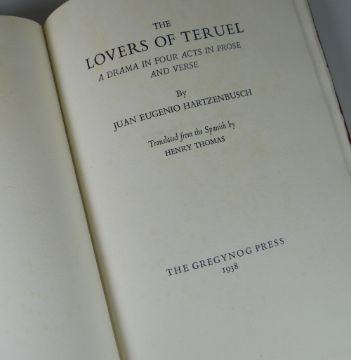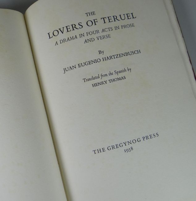 J B HARTZENBUSCH fine limited edition (1/175) Gregynog Press volume - 'The Lovers of Teruel', dated 1938, copy in full red crushed Morocco-binding, together with a fine limited edition (1/75) volume of 'The Gregynog Press' by THOMAS JONES dated 1954, copy with dust-jacket and a framed Peter Reddick 'Gregynog Hall' wood engraving print with poem by Norman Schwenk