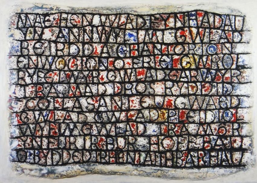 OGWYN DAVIES limited edition (50/100) print - text from Welsh National Anthem 'Mae Hen Wlad fy Nhadau', signed with thumbprint, 38 x 49cms
