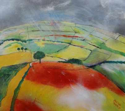 PAUL REES FRSA acrylic on board - colourful hilly landscape with fields and trees, entitled verso 'Mehefin' signed and dated 2010, 41 x 46cms