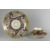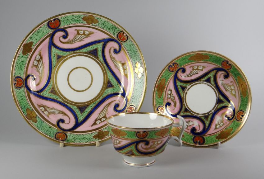 A SWANSEA PORCELAIN PART TEA-SET pattern No. 478 with seeded green border and scrolls with cobalt-blue detail, floral motifs and salmon-pink reserve, comprises breakfast-cup, saucer and plateCondition: chip to rim of saucer and hairline, restoration to plate