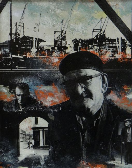 PAUL REES FRSA mixed media on board including collage, acrylic and stencil-work - images from old-Cardiff entitled verso 'Dockland Memories', signed and dated 2004, 47 x 37cms