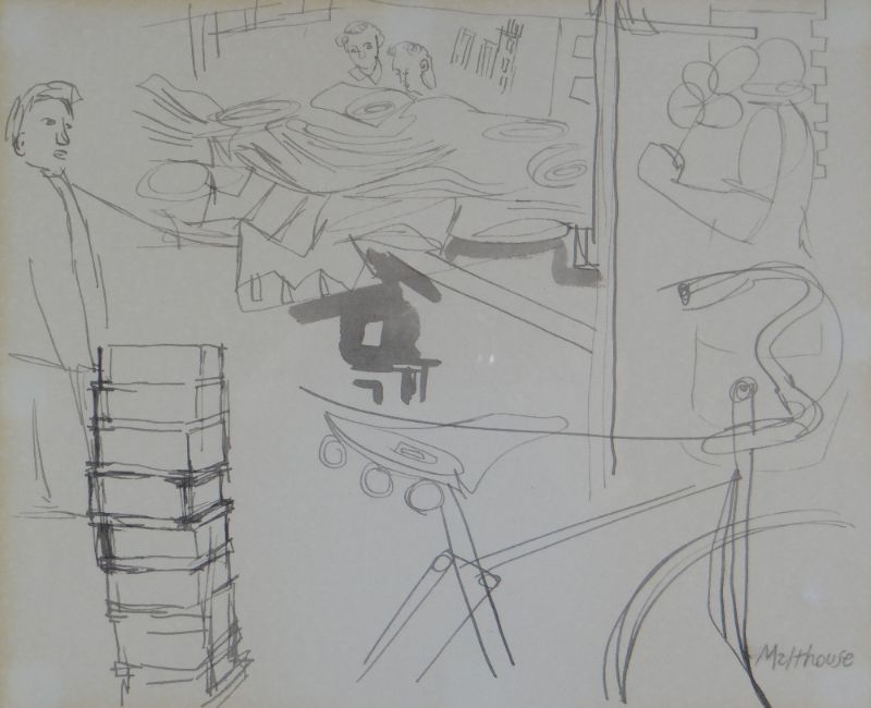 ERIC MALTHOUSE pen & ink drawing - figures and bicycle, signed, 23.5 x 28cms