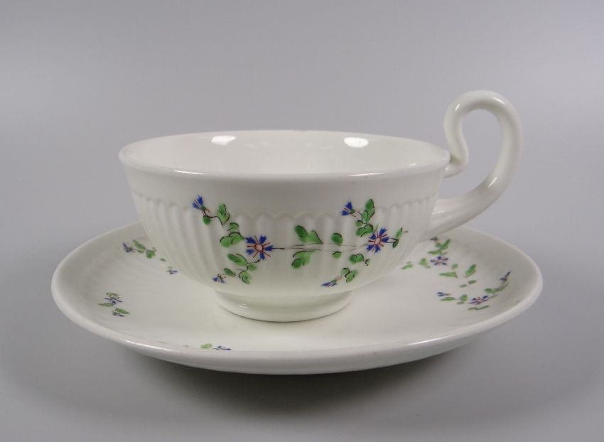 A SWANSEA PORCELAIN PARIS FLUTE BREAKFAST CUP & SAUCER decorated with vines of stylized blue flowers & green leaves, stencilled SWANSEA mark to base