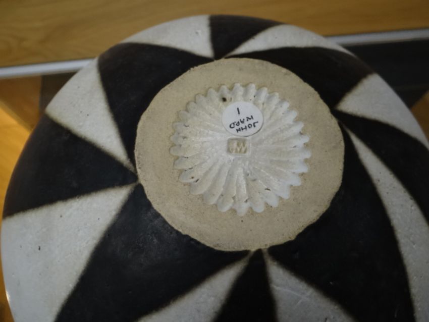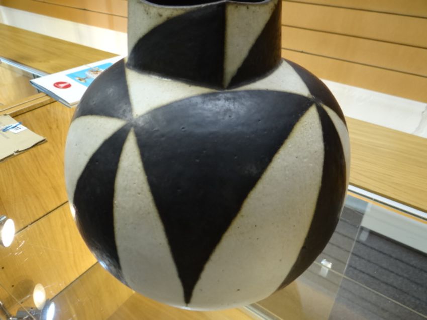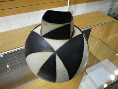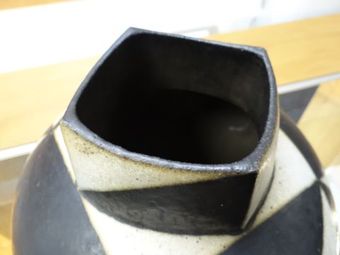 JOHN WARD stoneware - ovoid vase with tapering square neck & decorated with irregular black & white panels, impressed monogram to base, 26cms highcondition report:Its all good, no issues at all
