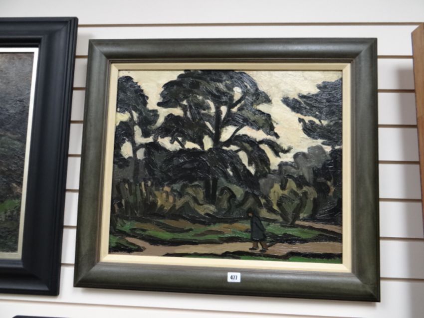SIR KYFFIN WILLIAMS RA oil on canvas - gentleman figure in hat and overcoat walking amongst trees, entitled 'A Walk in Hampstead Heath', circa 1950s, 49 x 59cms