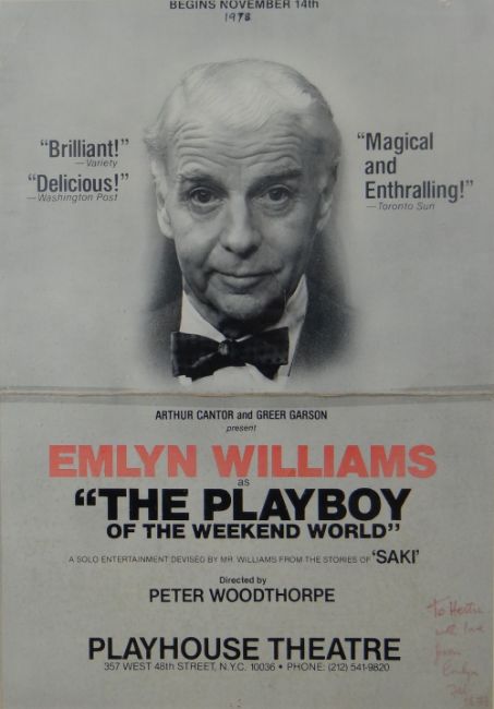 EMLYN WILLIAMS signed theatre poster - the actor as 'The Playboy of the Weekend World', inscribed 'To Hettie, with love from Emlyn, Feb 1979', 50 x 35cms