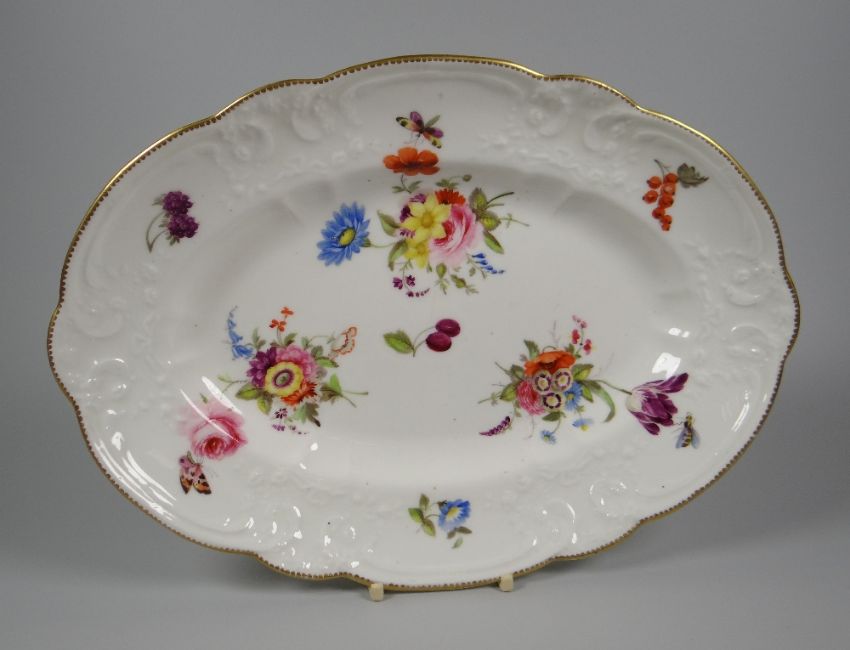 A NANTGARW PORCELAIN OVAL DISH moulded with sea-scrolls, flowers & wreaths, the interior painted with three sprays of flowers & with three sprigs to the border & three insects, impressed mark NANTGARW CW to base, 30cmsCondition: slight surface scratches, very slight wear to decoration and to gilding, but structurally sound without breaks / restoration
