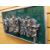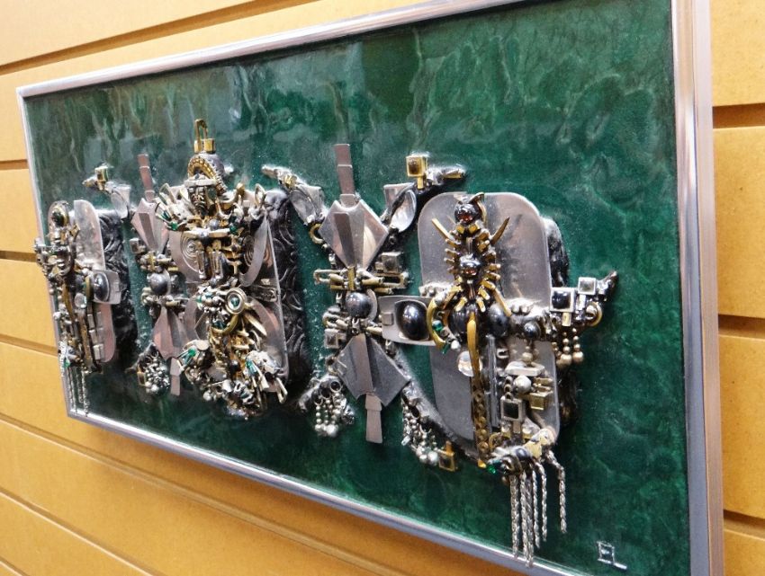 ELIZABETH LEWIS relief construction using scrap metal and mixed media on green laminated board - abstract, signed with initials and with artist's label verso, 31 x 62cms
