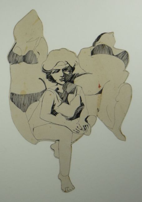 JOHN UZZELL EDWARDS two framed pen and ink drawings, one cut-out - a bonneted lady, 30 x 22cms and sun-bathers, 41 x 30cms