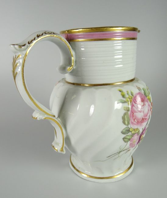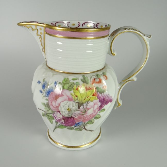 A FLORAL DECORATED PORCELAIN JUG BY THOMAS PARDOE the body with swirl fluting and with a wide cylindrical ribbed neck to a scrolling handle, decorated at Bristol with the factory possibly being Herculaneum of Liverpool, 18cms high