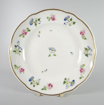 A NANTGARW PORCELAIN PLATE of lobed form and painted with sprigs of flowers, possibly by Billingsley within a gilded rim, impressed mark NANT GARW CW to base, 21cms diam
