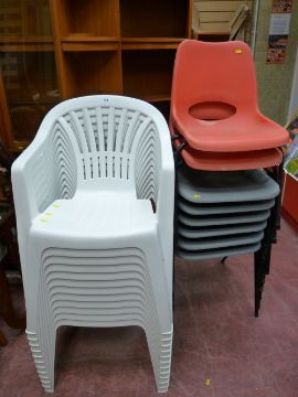 Quantity of white plastic garden chairs and a quantity of hard plastic stacking chairs