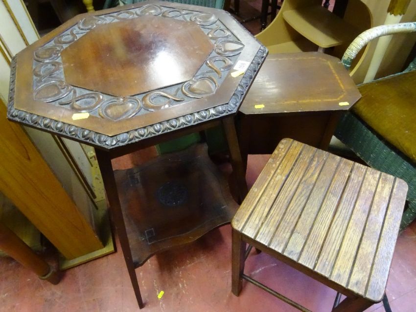 Carved octagonal occasional table with lower tier, a sewing box and a small occasional table