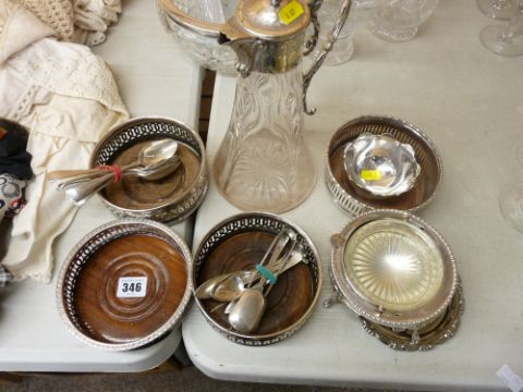 Four good electroplate wine coasters, an etched glass claret jug and similar items