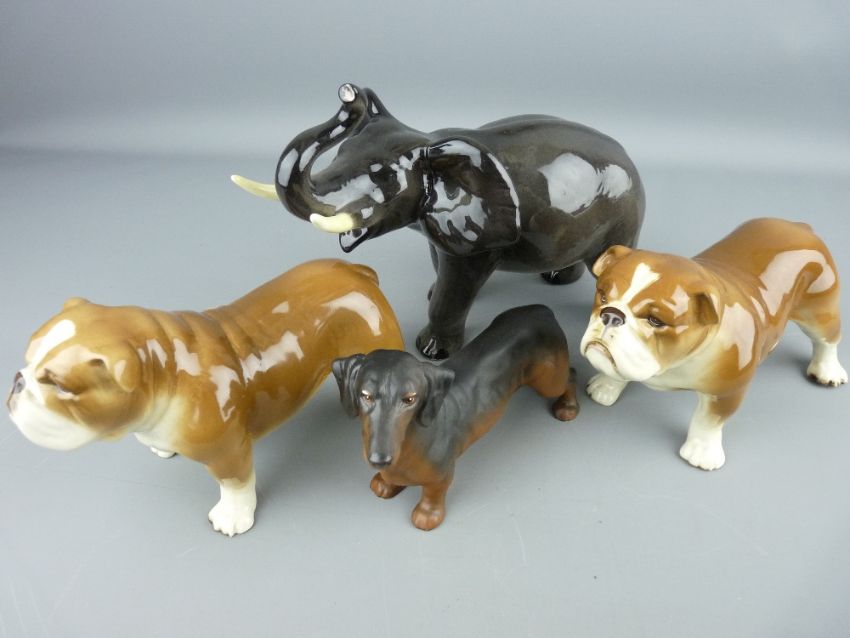 Beswick dachshund, two china bulldogs and a Melba ware figure of an elephant