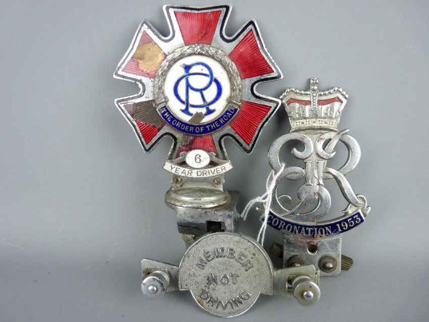 Three vintage car badges including a Spencer London 'The Order of the Road' enamel badge with six year driver attachment no. A3344