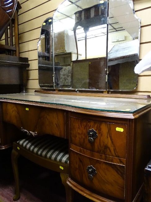Walnut bedroom suite comprising twin wardrobes, mirrored dressing table and stool