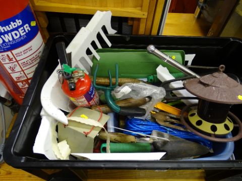 Crate of garden and other small hand tools and two fire extinguishers
