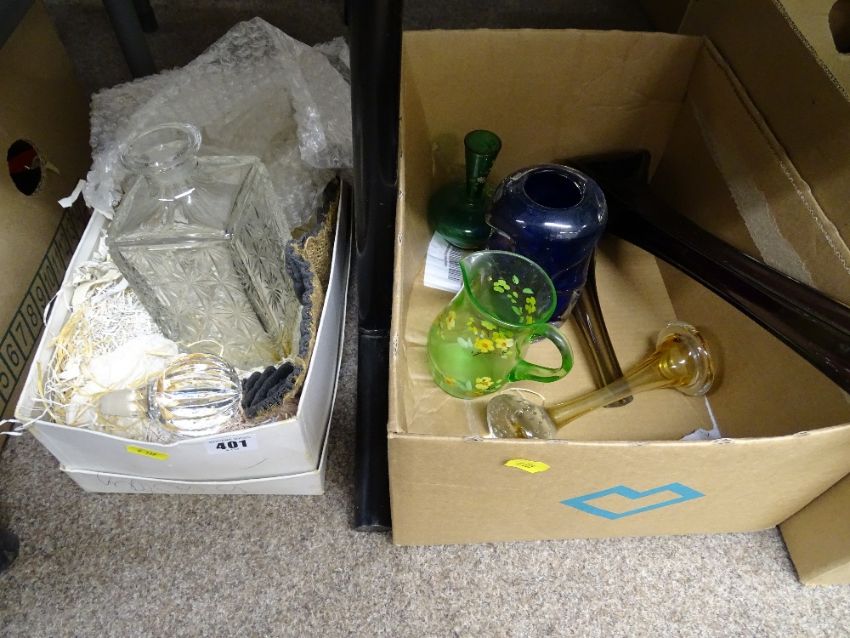 Vintage decanter and stopper, selection of decorative glass vases etc