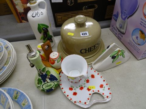 Stoneware cheese dome, fruit decorated pottery oil bottles etc