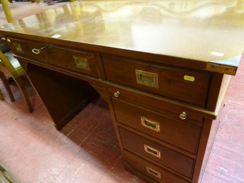 Reproduction mahogany campaign style desk with inset brass handles and corner mounts