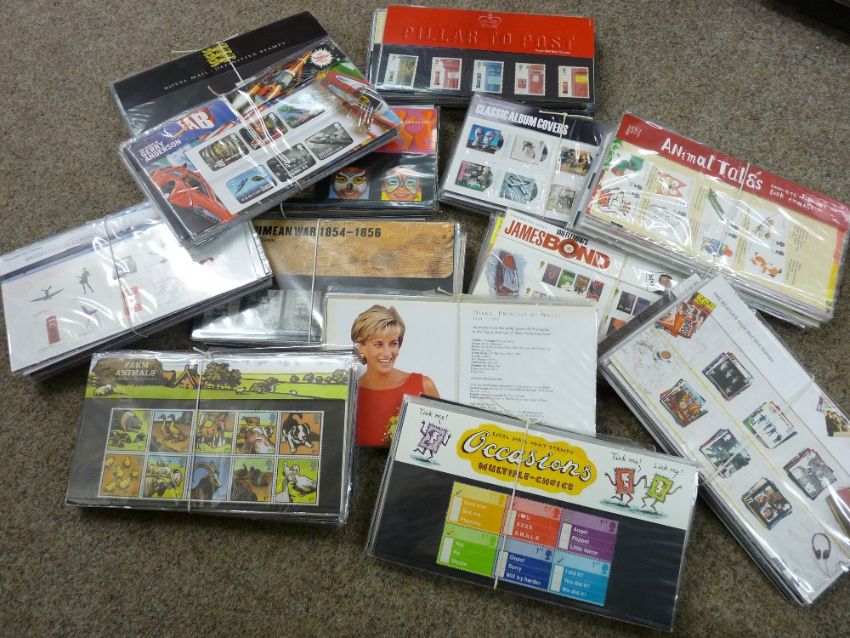 Large collection of unopened Royal Mail mint stamps, approximately two hundred packs