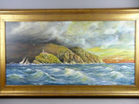 JOHN LES PRITCHARD oil on canvas - rough seas with lighthouse and passing yacht, signed, 60 x 120 cms