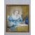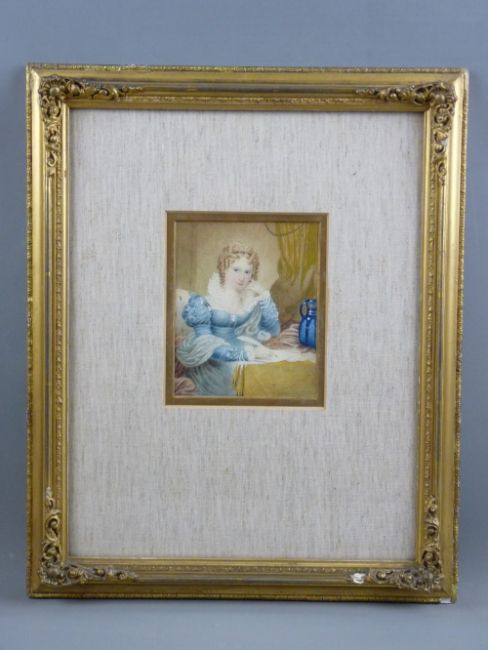 WATERCOLOUR - portrait on Whatman paper of a young woman in a blue dress with writing quill in hand, unsigned, 13.25 x 11 cms