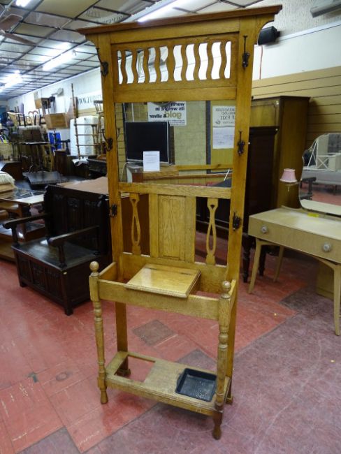 A VINTAGE BLONDE OAK MIRRORED HALLSTAND, 199 cms high, 93 cms wide overall, 27.5 cms deep