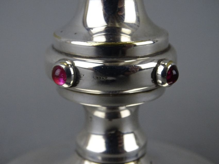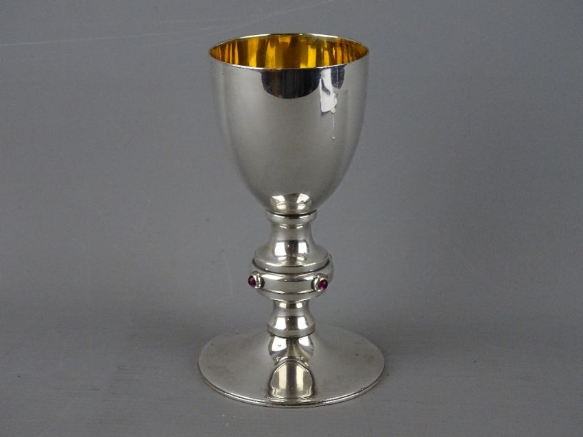 A BELIEVED SILVER, GILT INTERIOR CHALICE on a collared stem with circular foot, the collar having amethyst cabochon settings, marks rubbed and indistinct, 14 cms high, 7 troy ozs