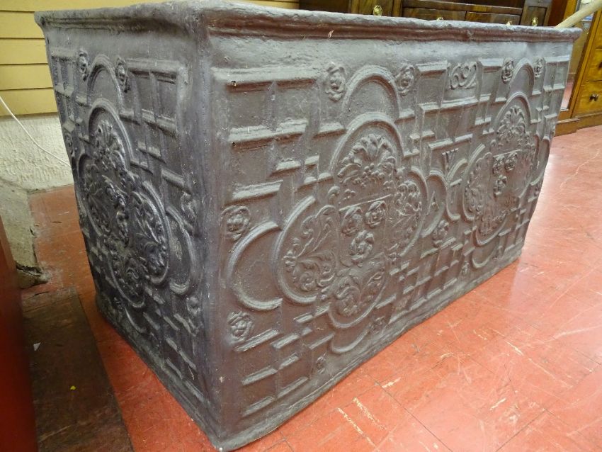 A COMPOSITE REPRODUCTION OF A LARGE GEORGIAN LEAD PLANTER, a small example, two galvanized watering cans, a vintage rake and a cast iron sheep doorstop, 75 cms high, 126 cms wide, 71 cms deep the planter