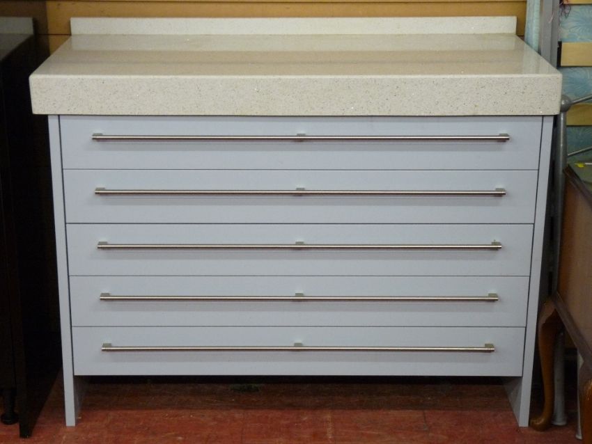 A CROWN IMPERIAL FIVE DRAWER WORKSTATION, ultra-modern with faux granite top and easy-glide drawers, 97.5 cms high, plus small back rail, 130 cms wide, 64 cms deep maximum