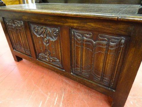 AN OAK BOX SEAT MONK'S BENCH with good linenfold carving to the panels, 100 cms high, 105 cms wide, 47 cms deep (in bench form)