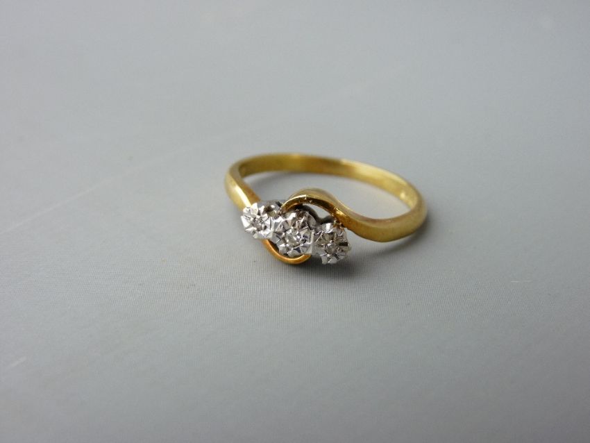 THREE DIAMOND SET GOLD RINGS to include a nine carat gold and platinum single stone in illusion setting, 1.6 grms, size 'O', an eighteen carat gold crossover ring with three diamonds in illusion settings, 3.1 grms gross, size mid 'O' to 'P' and an eighteen carat gold leaf set four stone ring, 2.3 grms gross, size 'N'