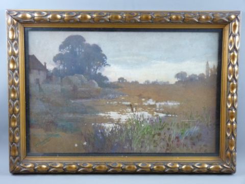 A F NEWTON watercolour - marshland scene with farmstead, signed, 35 x 55 cms